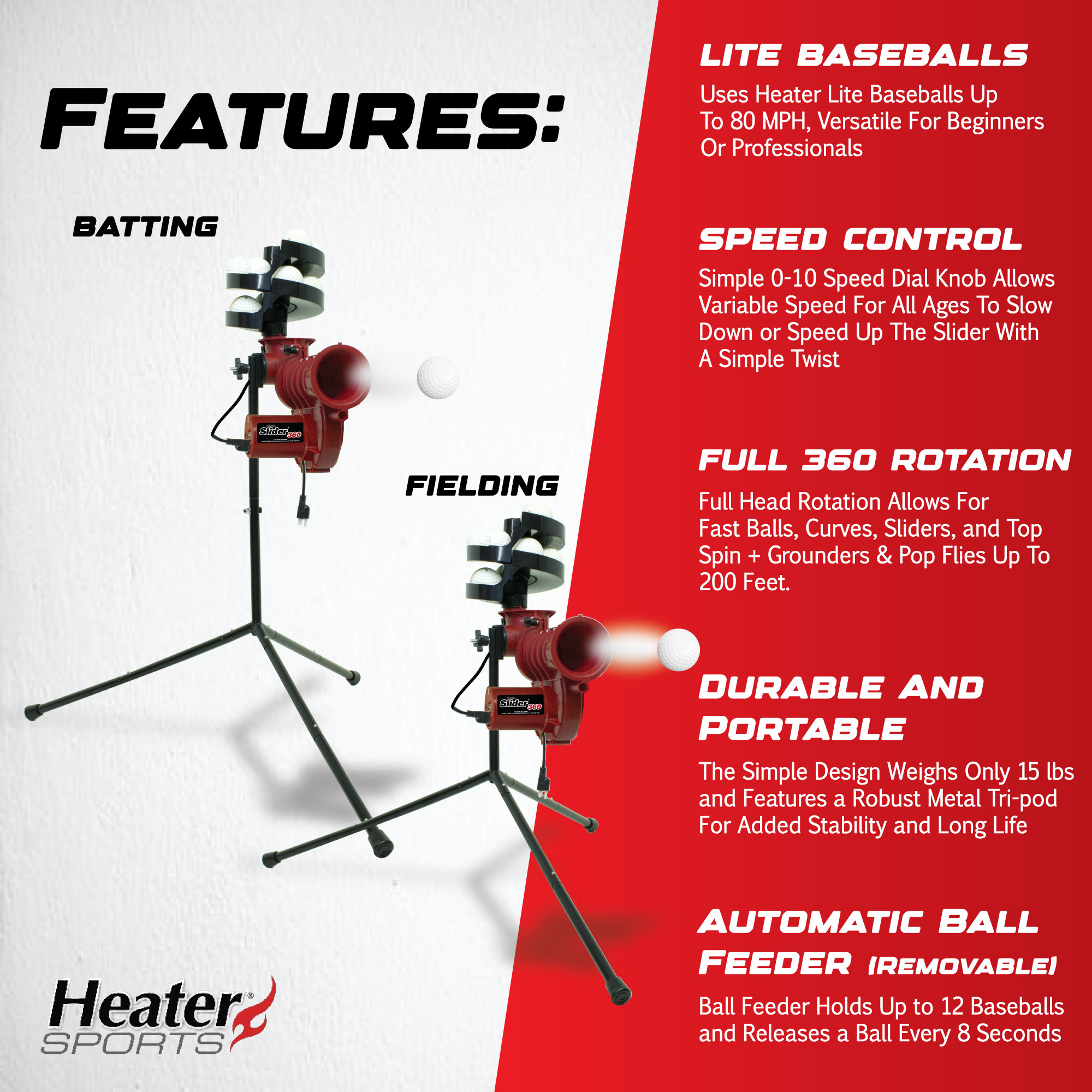 Variable Speed Lite-Baseball Machine With Auto-Ball Feeder For Fastballs, Sliders, & Curves from Heater Sports