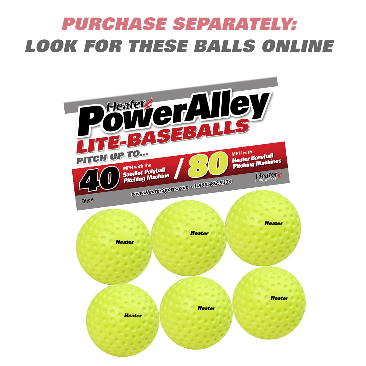 With a simple On/Off Switch, the Sandlot Polyester Baseball Pitching Machine is the easiest pitching machine to use. Plus, by moving the machine closer or further from the batter, you can simulate speeds from 15-50 MPH! The Automatic Ballfeeder will deliver 1 ball every 8 seconds so the batter can perfect their timing and prepare for strike after strike.